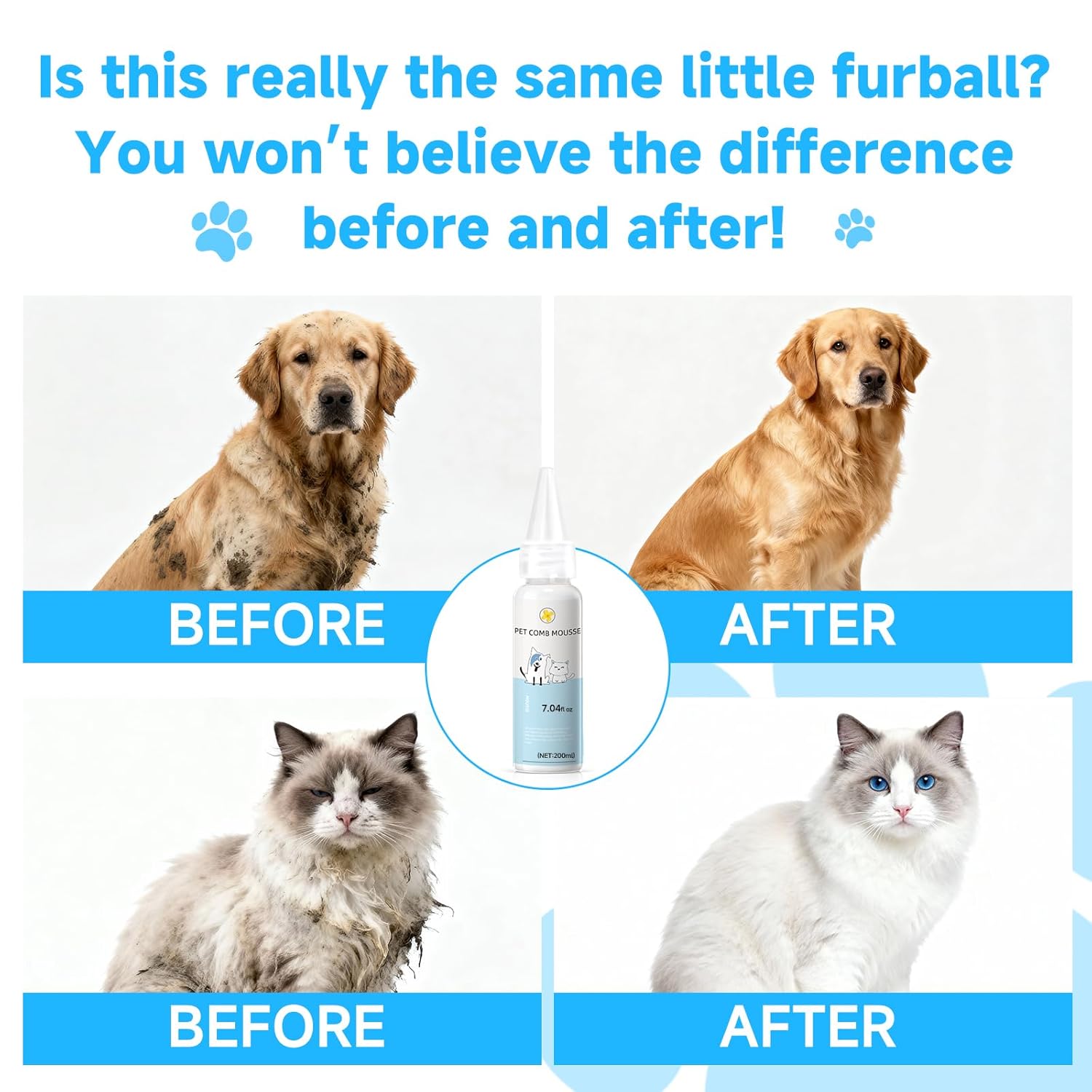 - Concentrated Waterless Shampoo (Pet Comb Leave-In Serum): Made with natural, non-irritating ingredients, this Waterless Shampoo is a gentle grooming solution suitable for all pets. It gently cleanses, moisturizes, and smooths fur, helping maintain your pet’s coat between baths—perfect for sensitive or young pets. Pet Steam Brush not included.