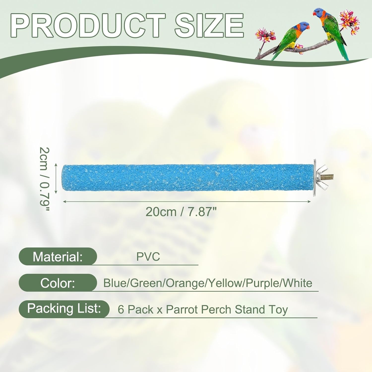 - Product Specifications:Size:20 x 2 cm / 7.87 x 0.79 inch (L x W); Color: Blue/Green/Orange/Yellow/Purple/White; Material: Wood; Packing List: 6 Pack x Parrot Perch Stand Toy