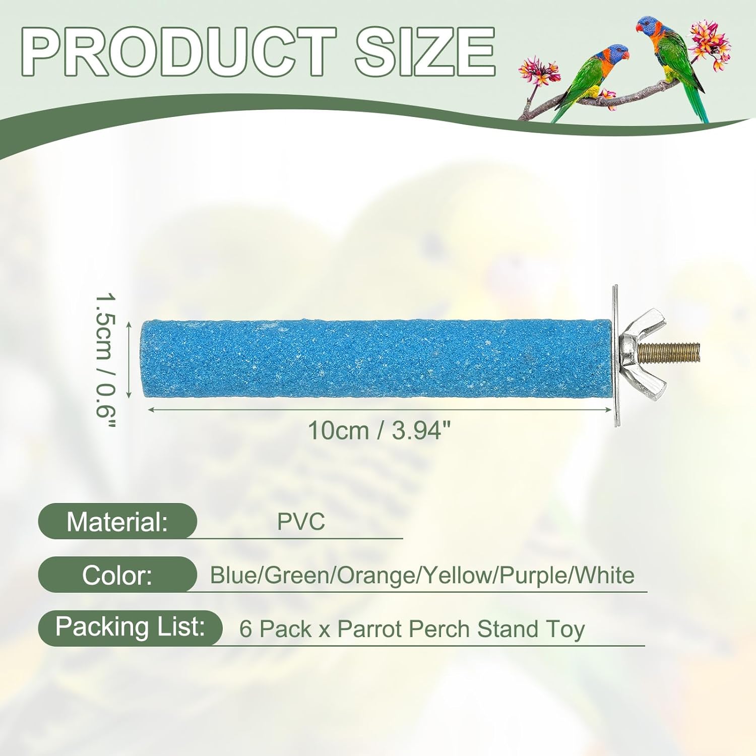 - Product Specifications:Size:10 x 1.5 cm / 3.94 x 0.6 inch (L x W); Color: Blue/Green/Orange/Yellow/Purple/White; Material: Wood; Packing List: 6 Pack x Parrot Perch Stand Toy