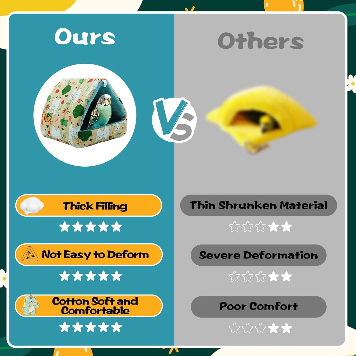 - 【Skin-friendly 3-Layer Plush】 : Three layers design— natural cotton outer, high-density sponge middle, crystal velvet inner. This combination ensures your pet enjoys a warm, soft, and snuggly bird bed.