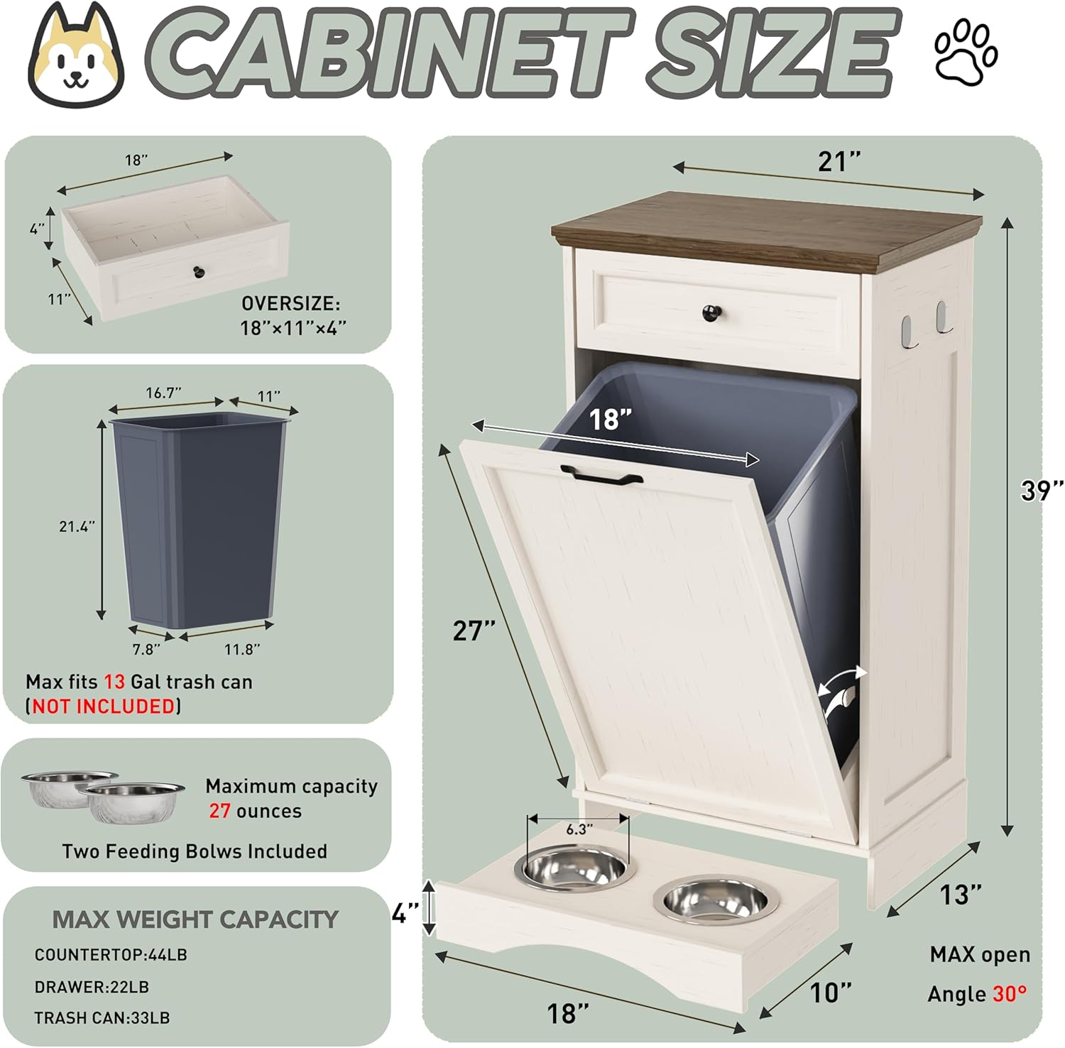 - Ample Pet Supply Storage: Overall size: 13” D x 21” W x 39” H, This tilt-out pet storage cabinet features a spacious drawer, a handy countertop, and a convenient tilt-out compartment for storing food bags, including dog food storage. The side hooks are perfect for hanging leashes and tools, while the top surface is ideal for pet toys, treats, and even a photo of your furry friends!