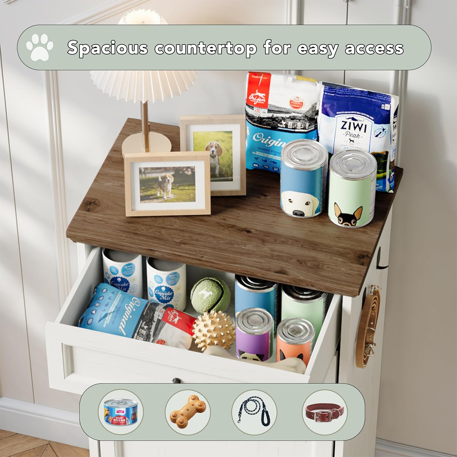FIMELLO Dog Feeding Station, Tilt-Out Dog Food Storage Cabinet with Drawer,Pet Feeder Cabinet,White Grain