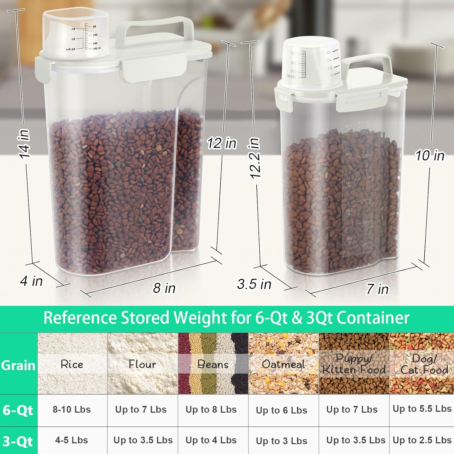 - Large Pet Food Container Set: TBMax dog food storage containers come with a 6-qt bin and a 3-qt bin that can hold about a 8 -10 lbs bag of dry dog food or cat food, which depending on the particles of the pet food. Ideal for storing small pet food like kitten puppy kibble, bird seeds, fish food and more