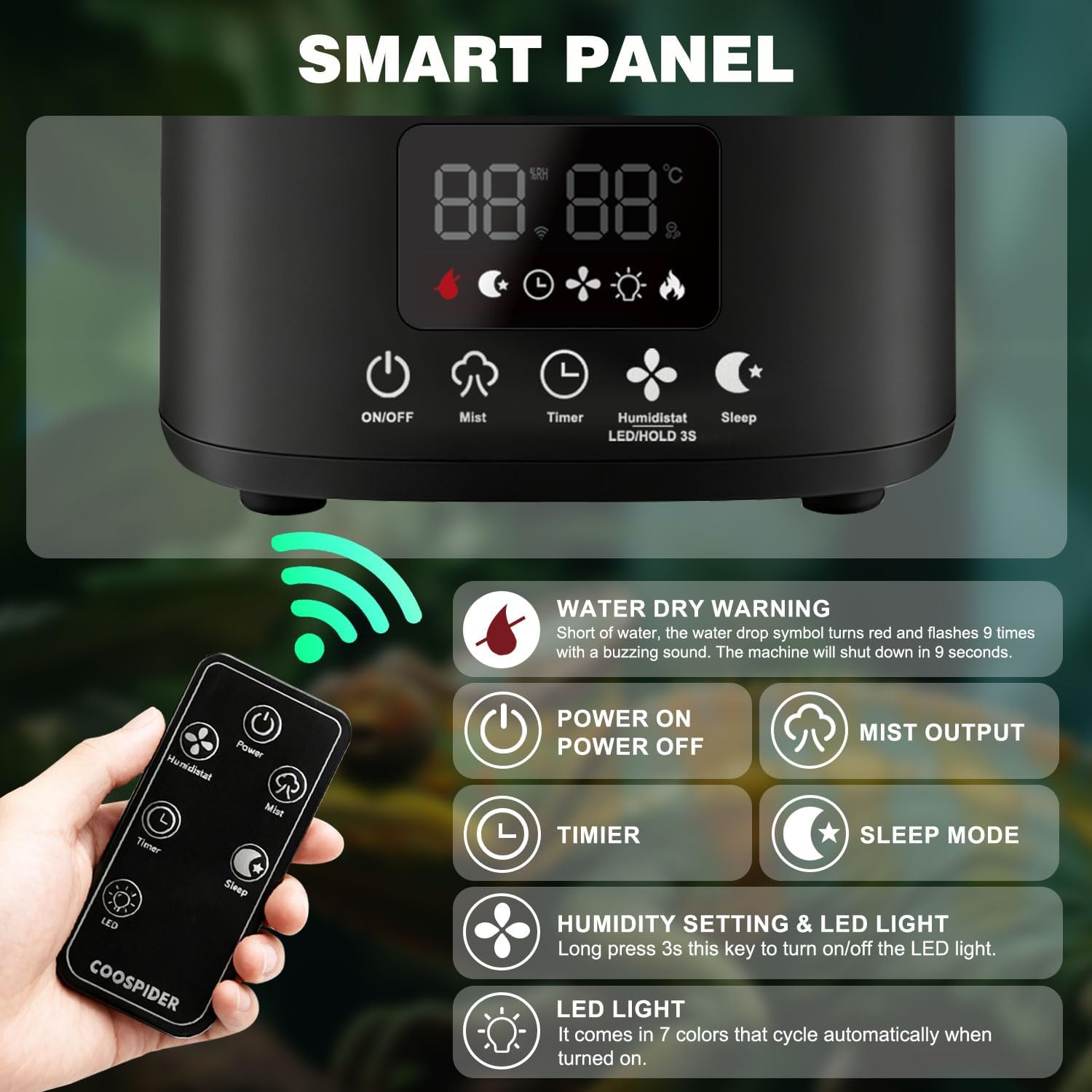 - TIMER & HUMIDITY SETTING: This humidifier for reptile tanks has a built-in timer function, timing range is 1-12H (1h/time). It also has a humidity sensor and built-in humidity setting function, humidity range is 45%-90%(5%/time). This automatic reptile mister can work automatically according to your settings.