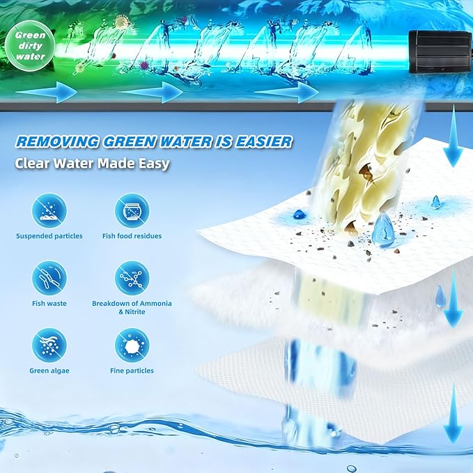 - Powerful algae killing effect - The fish tank filter uses ultraviolet algae killing and sock filter to filter impurities. Make your fish tank crystal clear in 3-7 days.