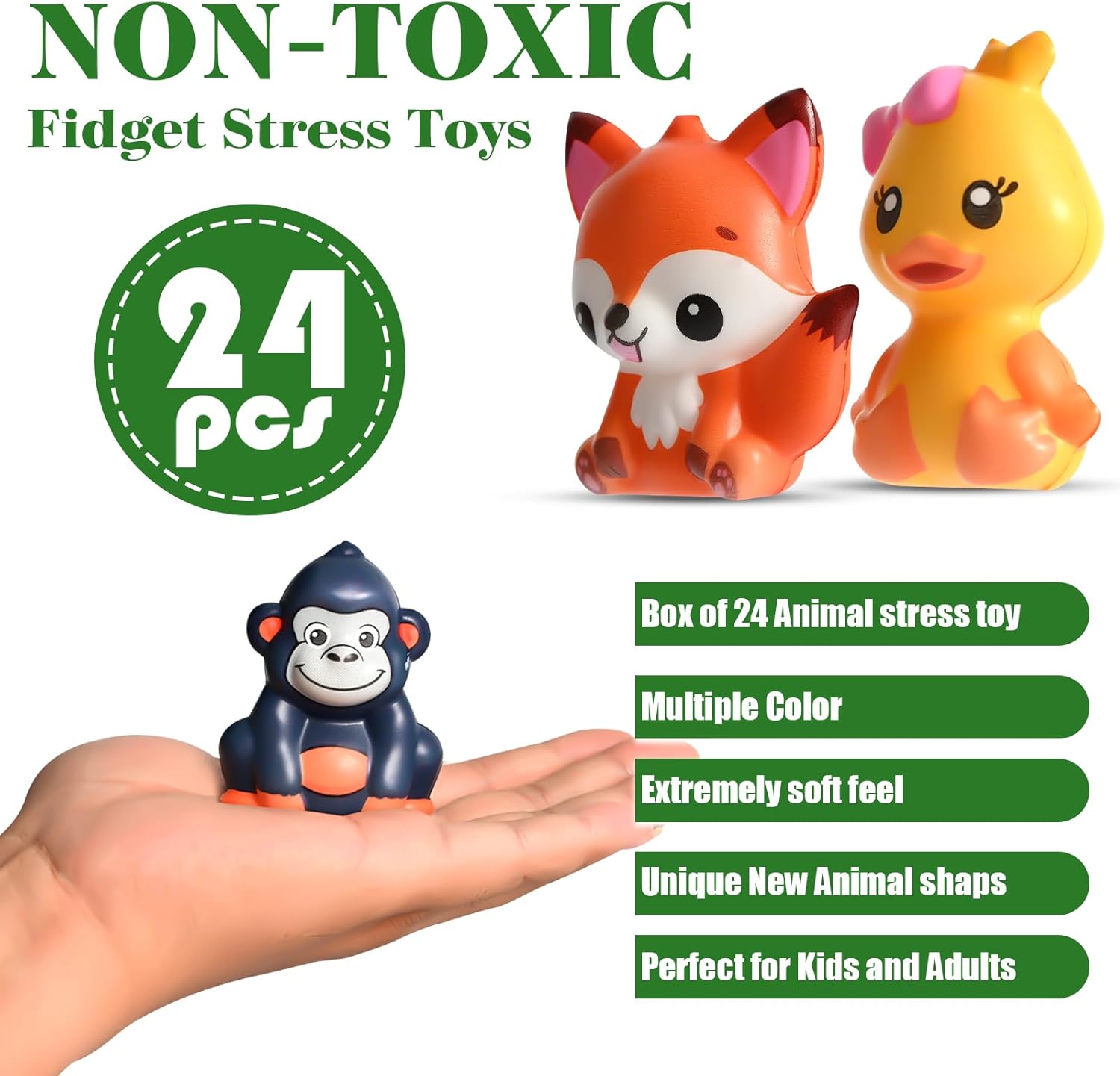 - 24 Unique Adorable Animal Designs: This set comes with 24 one-of-a-kind squishy toys, each shaped like a beloved animal—think elephants, lions, tigers, and more! Boasting bright, eye-catching colors and super cute details, they’re guaranteed to be a favorite with kids