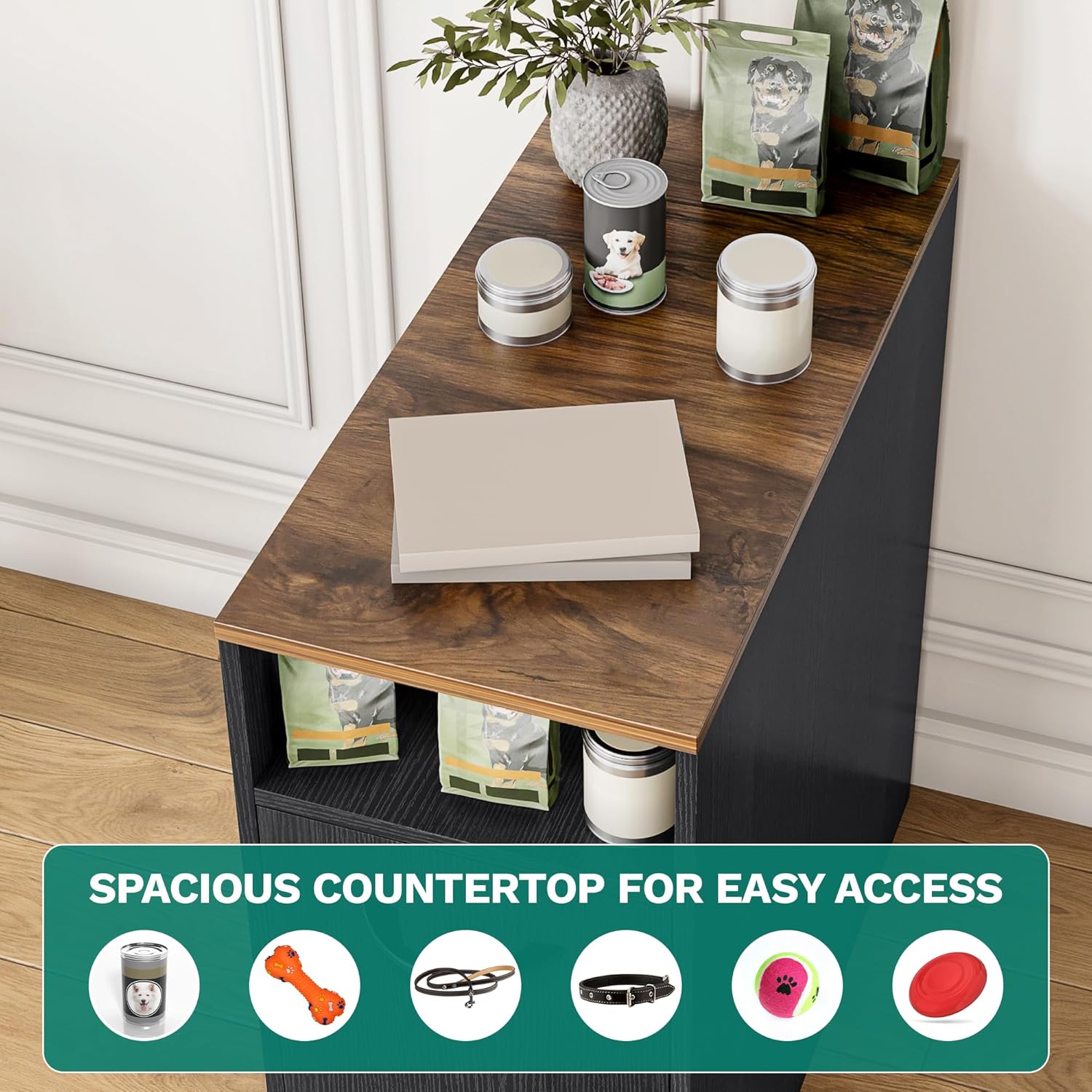 - Pet supplies storage: The tilted pet storage cabinet includes a tilted dog food storage cabinet and a spacious open compartment for storing all your pet supplies. The countertop can hold photo frames or snacks