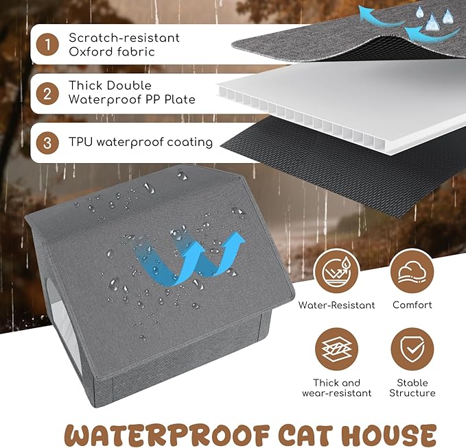 - ๐ฑ All-Season Weatherproof Protection : Every outdoor cat deserves a cozy home, and Fecuria outdoor cat house delivers exactly that! Built to last, it features scratch-resistant Oxford fabric, inner TPU coating, and PP plates, all working together to prevent water to seep into and add sturdy structure. Plus, the weatherproof door curtain lets cats enter and exit easily while keeping wind, rain, and snow out. More than a shelterโit's their safe, private spot, no matter the weather.