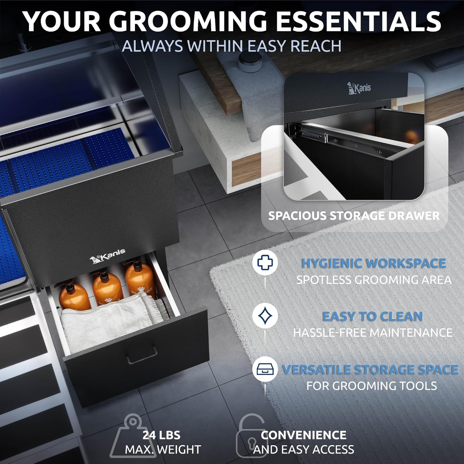 - SPACIOUS STORAGE & HYGIENIC SETUP: The sliding drawer holding up to 24 lbs, provides generous space for grooming tools and accessories. Keep essentials within reach while maintaining a clean pet wash station with hassle-free upkeep