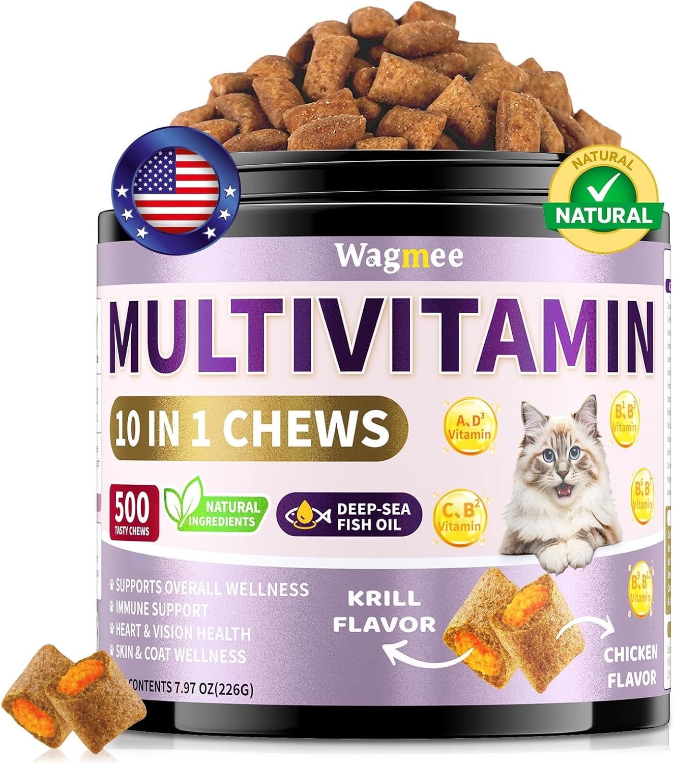 - 10-in-1 Comprehensive Support: Our cat multivitamin crunchy chews provide a complete multivitamin formula enriched in 10 vitamins and fish oil. They help to support overall well, including energy levels, bones & joints, heart & eye support and a shiny skin & coat.