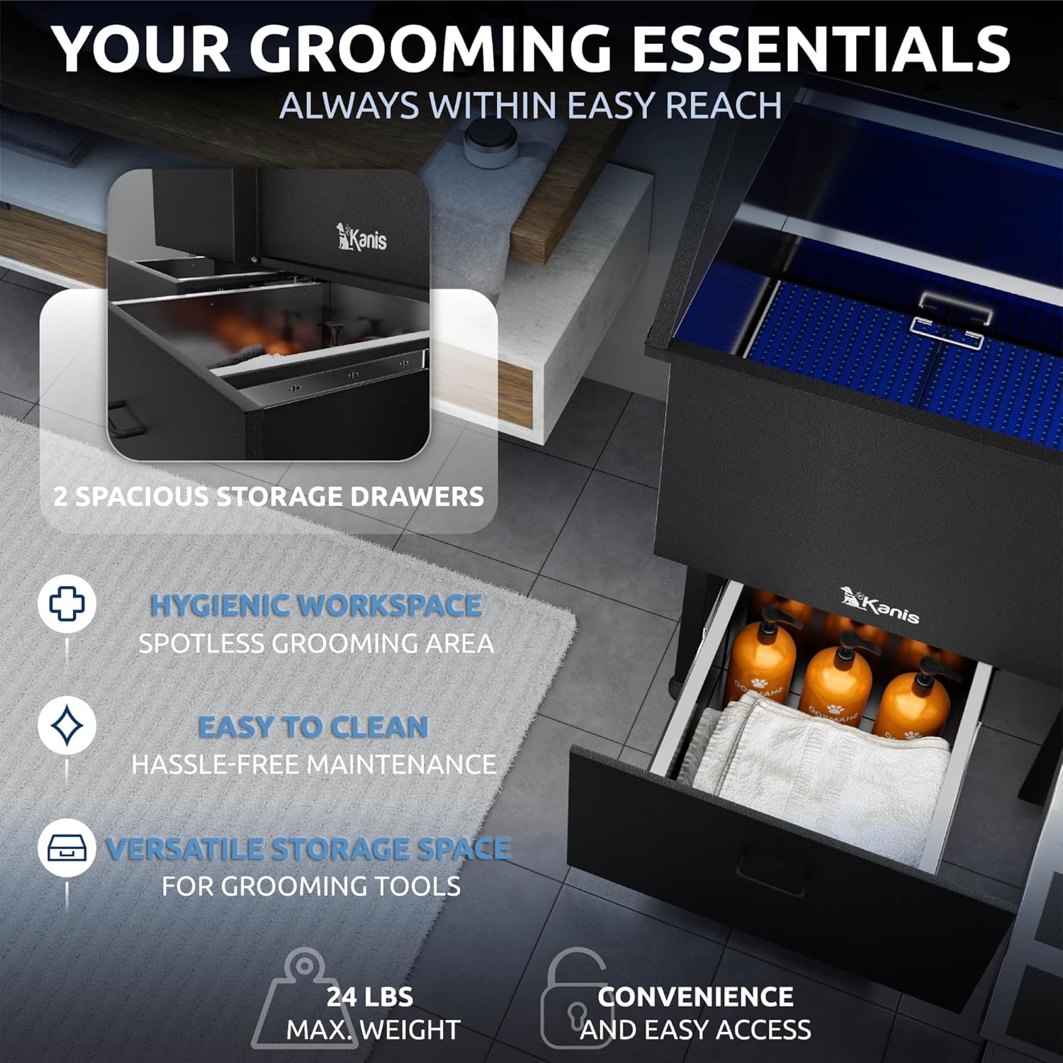 - SPACIOUS STORAGE & HYGIENIC SETUP: Two sliding drawers, each holding up to 24 lbs, provide generous space for grooming tools and accessories. Keep essentials within reach while maintaining a clean pet wash station with hassle-free upkeep