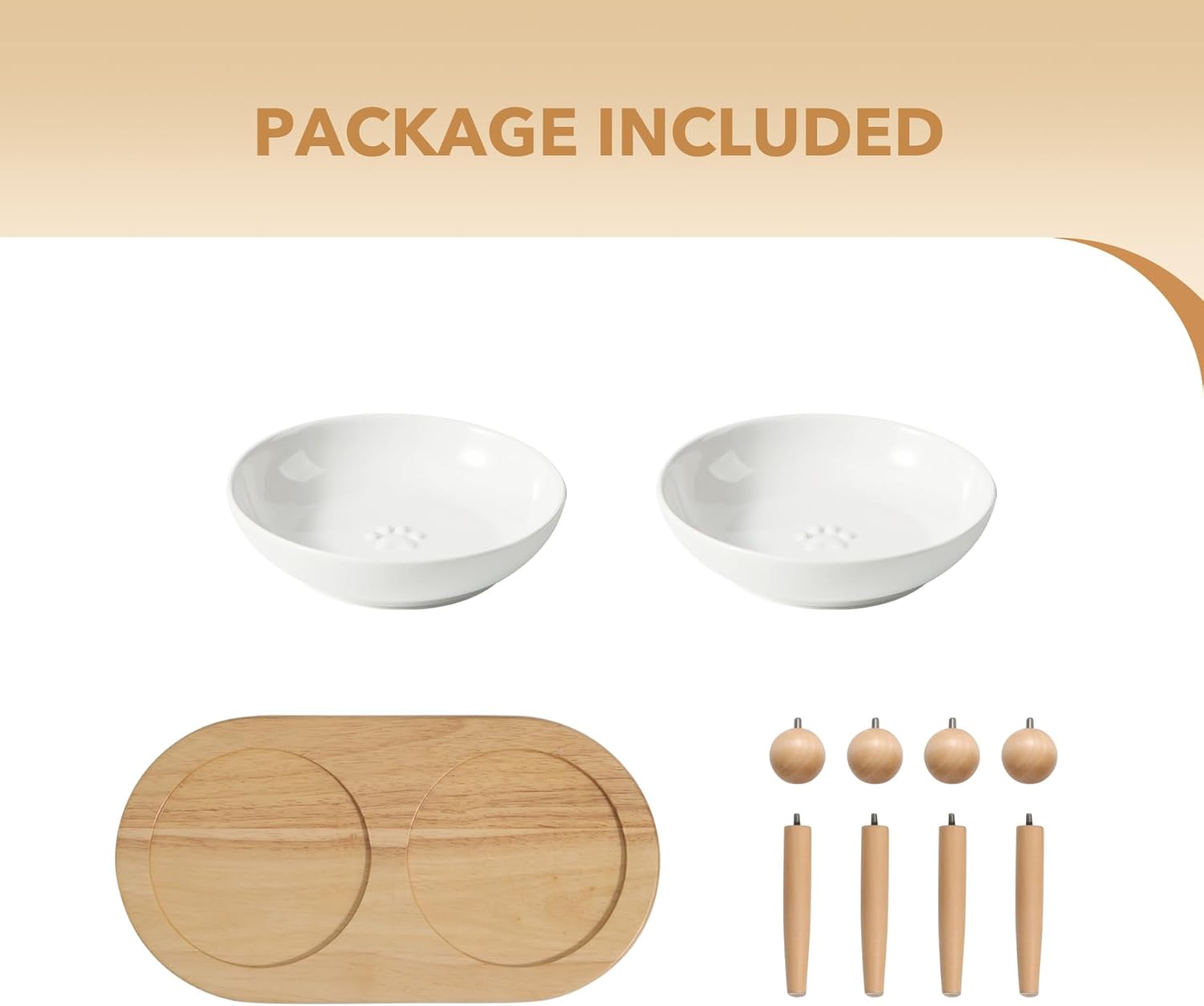 Raised Ceramic Wide Whisker Friendly Cat Dishes, Anti-Slip Food& Water Bowl with 2 Style Stand Adjustable Pet Bowl Set(2Dish+Stand, White)