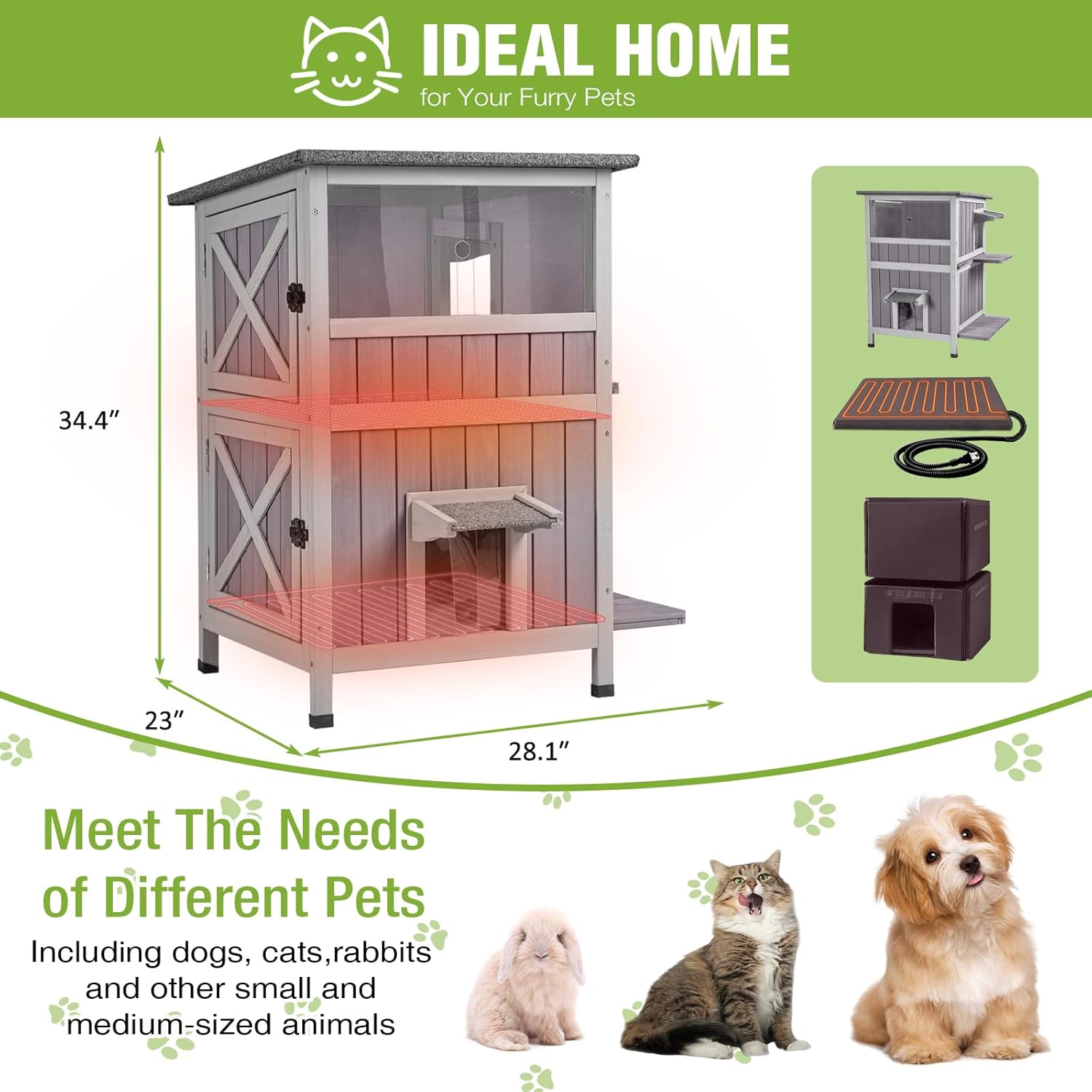 GUTINNEEN 2-Story Heated Cat House Large Outdoor Insulated Cat House Weatherproof Feral Cat Shelter with Heated Pad, Insulated All-Round Thermal Liner for 1-4 Cats (Winter-Ready)