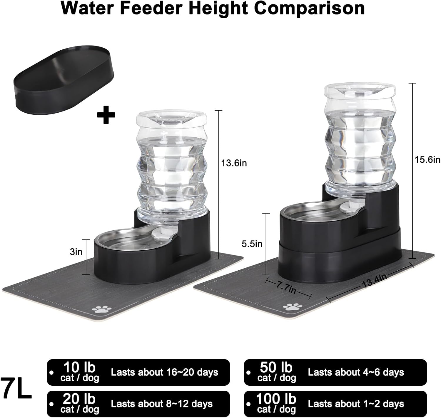 RIZZARI Automatic Cat Water Dispenser: Black 7L Elevated - Stainless Steel Gravity Feeder - Splash Guard Mat