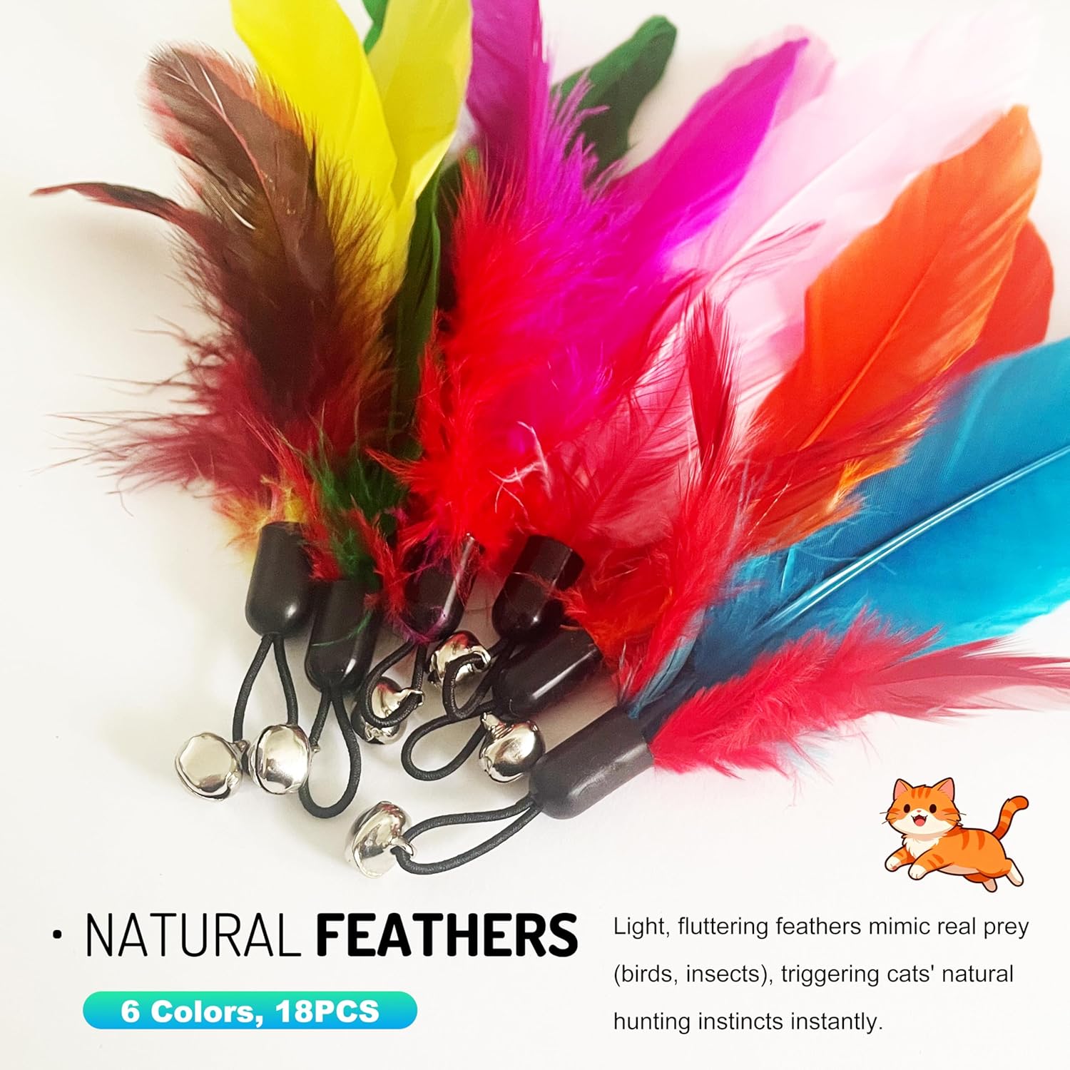- 【Natural Feathers with Easy-Clip Hooks & Bells】Each of the 18 vibrant refills is made from natural feathers for an authentic prey experience. They feature a secure metal hook for instant attachment and a built-in jingling bell to quickly capture your cat's curiosity and trigger their chase instinct.