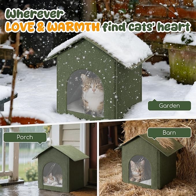 Outdoor Cat House Weatherproof, Insulated Cat Houses for Outdoor/Indoor Cats for Winter, Waterproof Feral Stray Cat Shelter with Warm Cushion and Door Curtain, Easy to Assemble, Olive Green