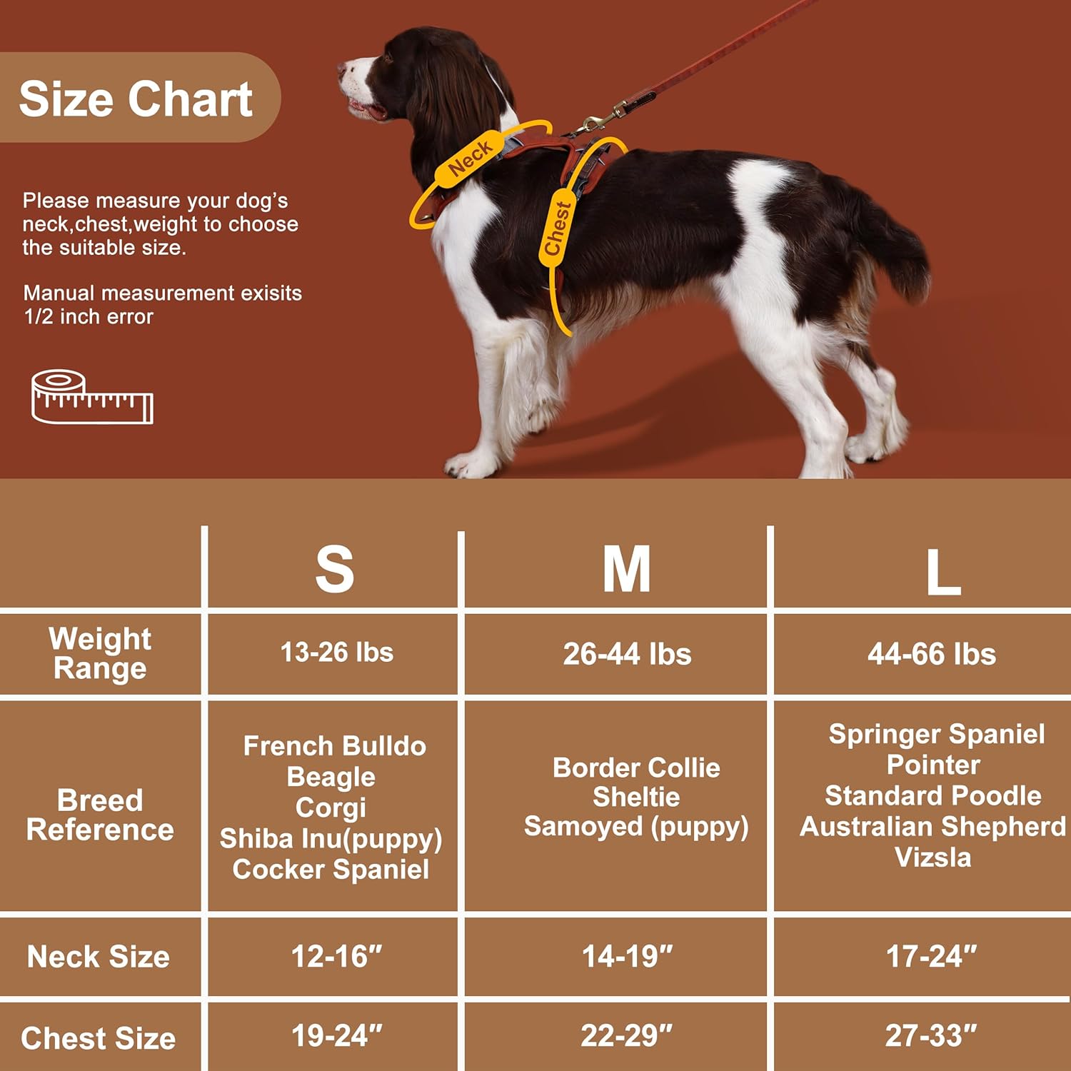 - Medium Dog Harness with Handle: (Chest 22-29",neck 14-19") perfect fit for small medium dogs recommend weight 26-44 lbs, such as Border Collie,Sheltie,Samoyed(small medium sized), etc. Measure your dog's chest and neck girth more than actual size of your pet