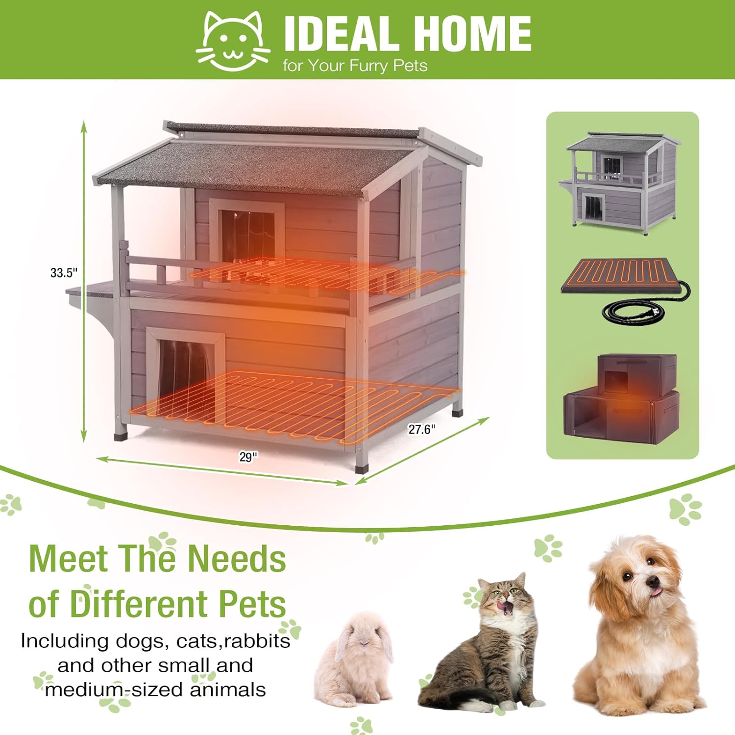 GUTINNEEN 2 Story Heated Cat House for Outside Outdoor Cat House Insulated Weatherproof Feral Cat Shelter with Heated Pad, Insulated All-Round Thermal Liner, Chewproof Cable for 1-4 Cats in Winter