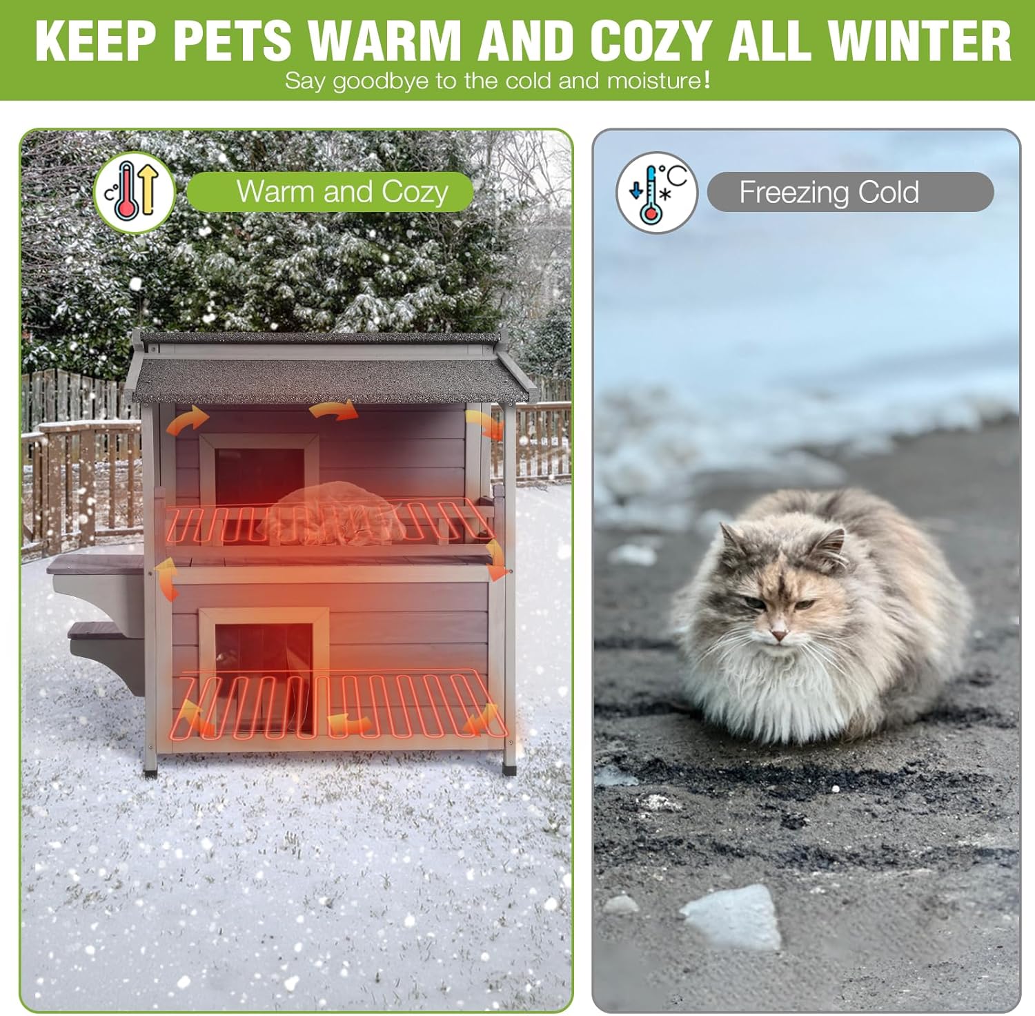 - SAFE HEATING SYSTEM DESIGN: Equipped with a UL-tested heating pad (automatic temperature control: 89–116°F/32–47°C) and built-in high-temperature protection device, the cat house prevents overheating or chilling. The pad is encased in a waterproof enclosure, with a 6.5 ft chew-resistant metal-reinforced cord for enhanced safety. It maintains reliable warmth through rain, snow, or ice, keeping cats dry and cozy