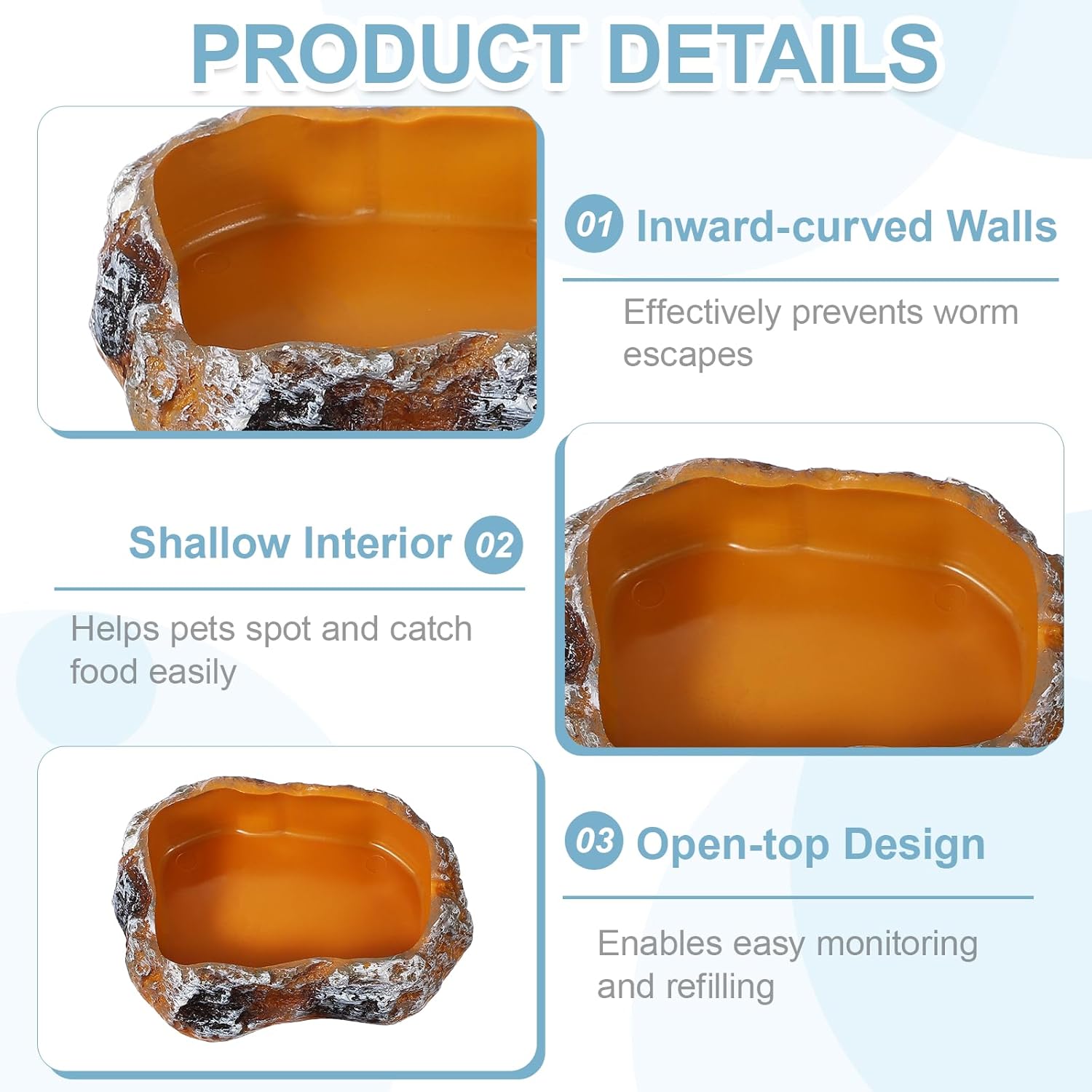 - Highlighted Features: The reptile feeding dish features inward-curved walls to effectively prevent worm from escaping, while its shallow interior allows pets to easily spot and catch their food, making feeding easier and hassle-free. Reptile water dish is lightweight yet stable construction prevents spills during active feeding sessions. The simple, open-top design allows hassle-free monitoring and refilling.