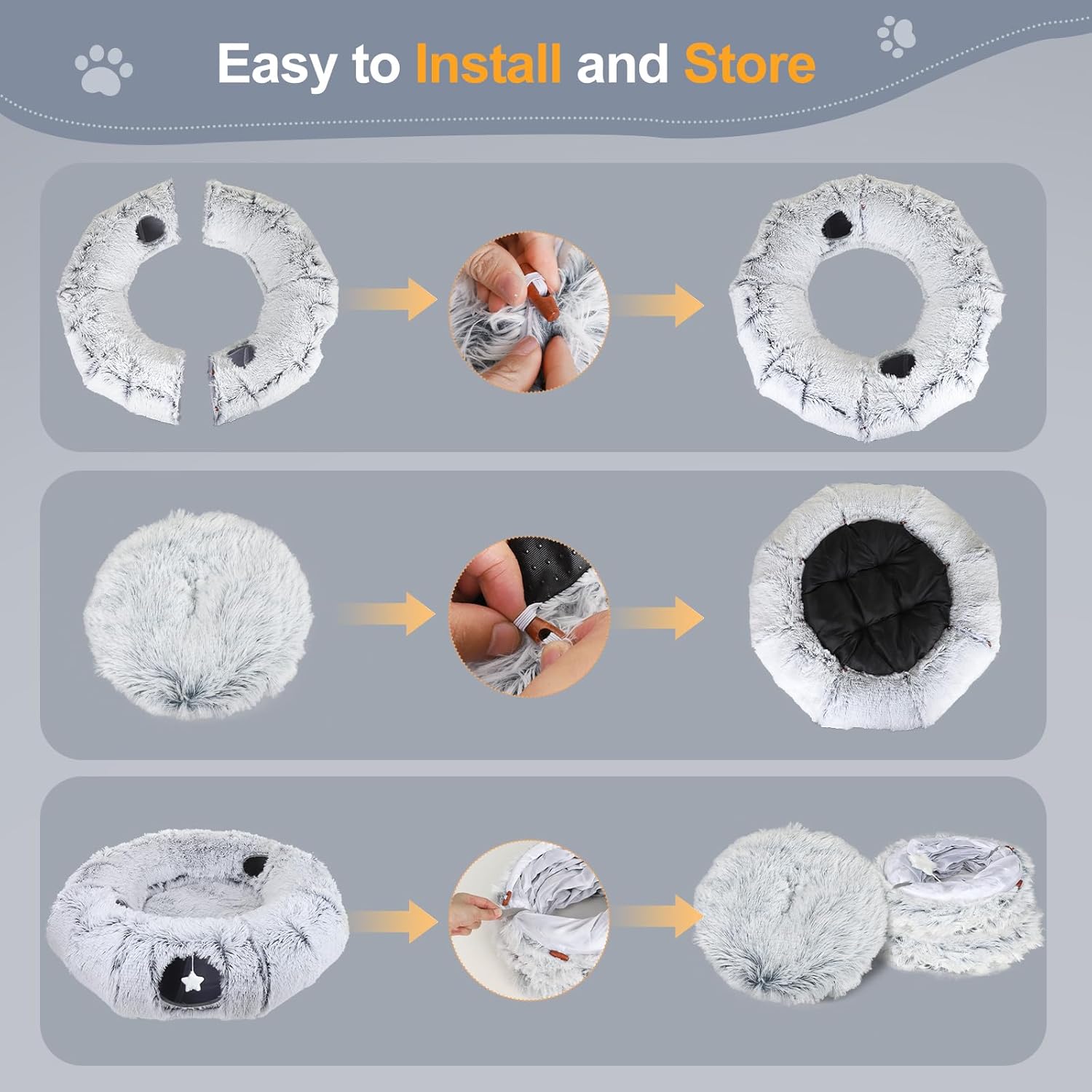- ๐Non-slip & Machine-washable Cat Bed: The bottom pad included with the cat tunnel features over 90% down filling for soft comfort. Due to extended shipping, if the down distribution appears uneven upon first use, gently shake the pad to redistribute it evenly. The non-slip fabric base prevents the bed from shifting. The base pad is machine washable, but the cat tunnel features a steel-ring reinforced frame and should not be placed in the washing machine.
