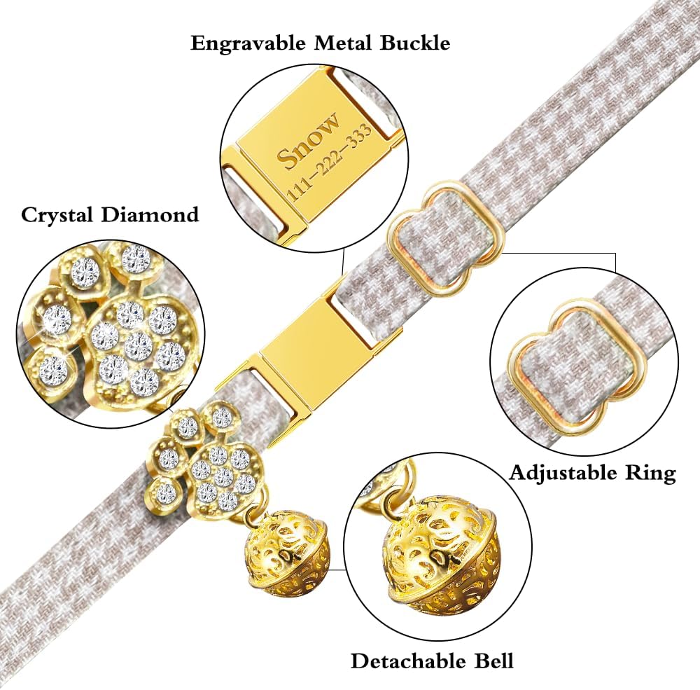 Personalized Breakaway Cat Collars - Magnetic Buckle, Bell - Safety Quick Release, Customized for Girls & Boys Cats- (Houndstooth-Khaki)