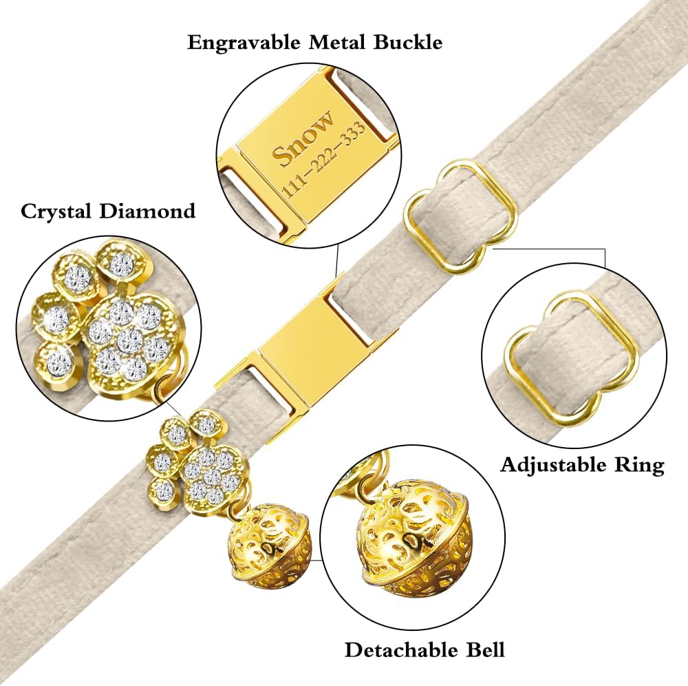 Personalized Breakaway Cat Collars - Magnetic Buckle, Bell - Safety Quick Release, Customized for Girls & Boys Cats- (Velvet-White)
