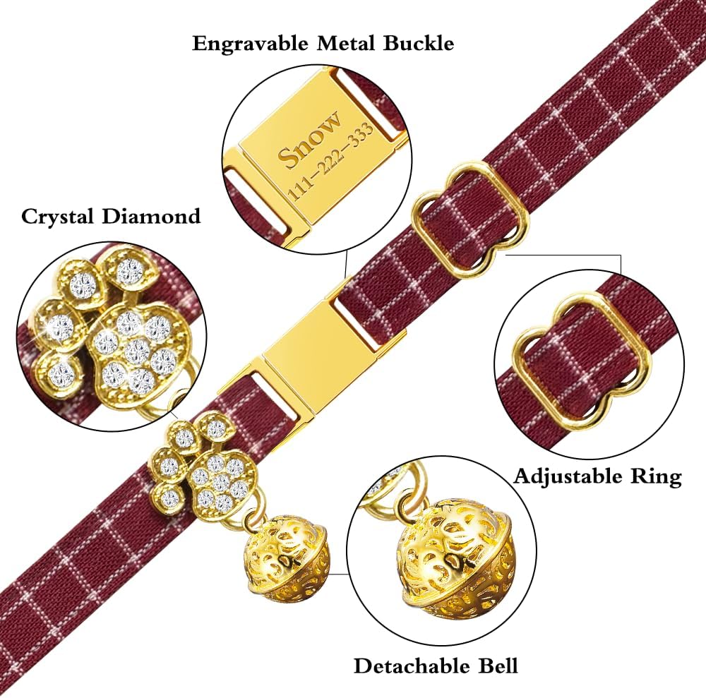 Personalized Breakaway Cat Collars - Magnetic Buckle, Bell - Safety Quick Release, Customized for Girls & Boys Cats- (Checkered-Red)
