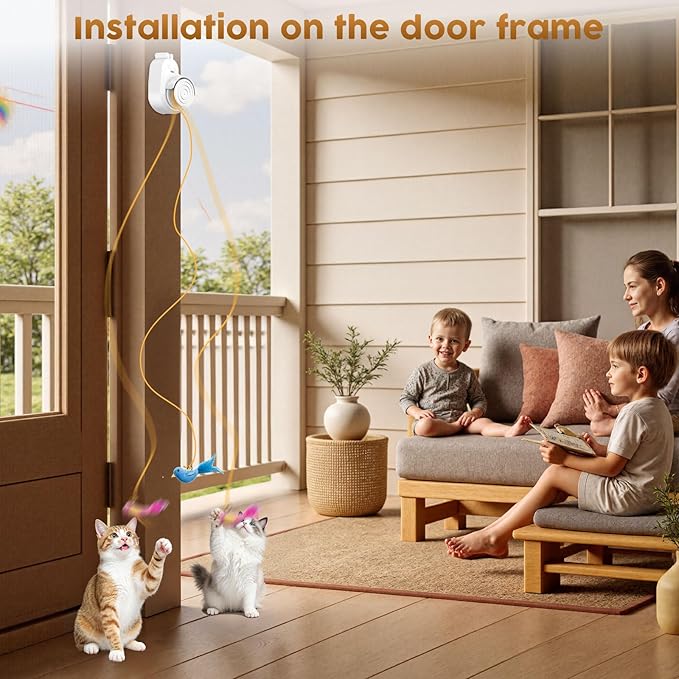 - USB-C Rechargeable, Built for Daily Use – A reliable rechargeable cat toy for multiple short sessions. Durable housing and reinforced tether handle everyday play in a multi cat home; quick to relocate room-to-room with tool-free mounting.