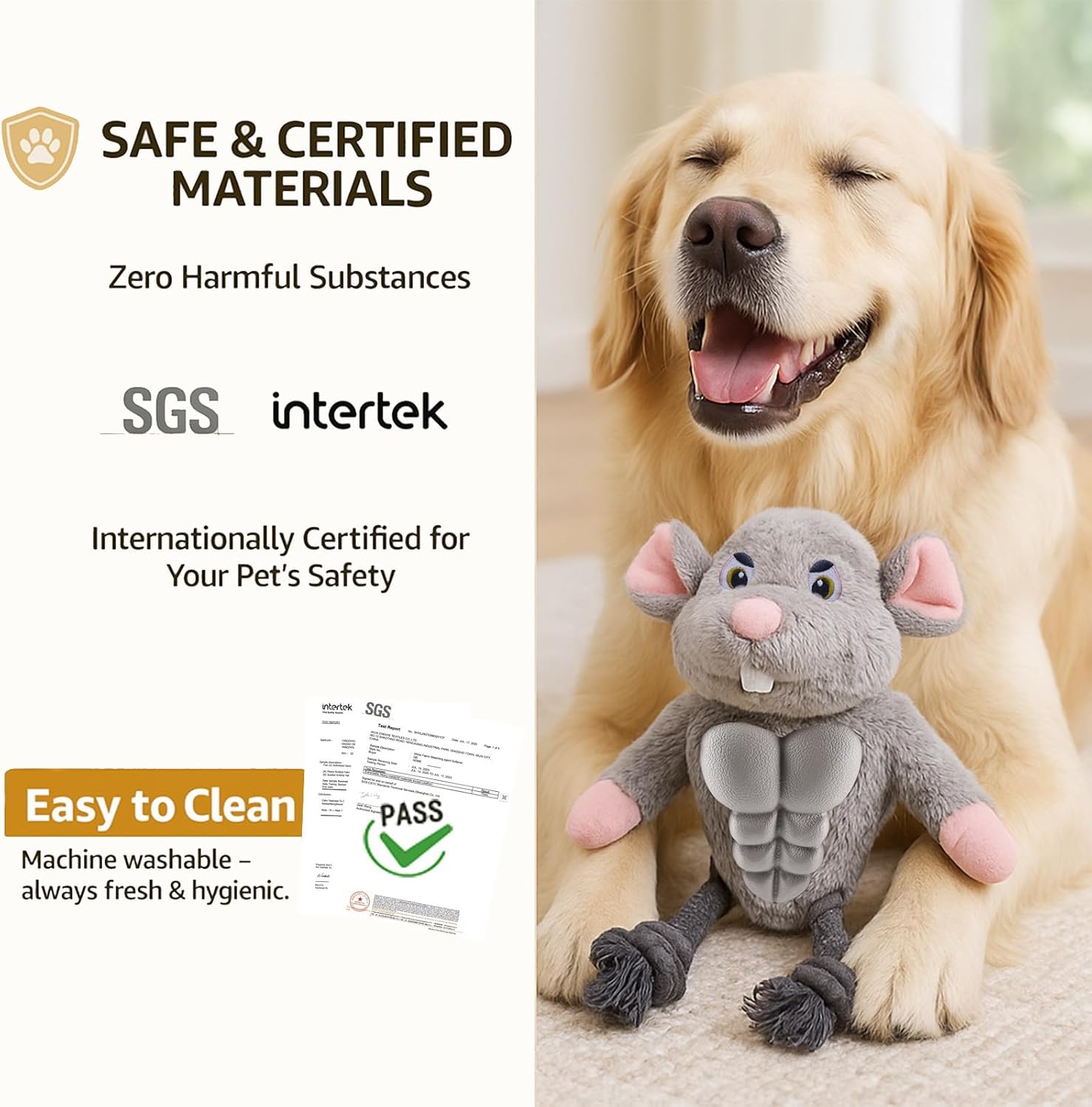 - 1. Unique Muscle Mouse Design with Rope Legs This plush gray mouse combines a hilarious rubber six-pack chest with durable knotted rope legs, creating a fun contrast that sparks your dog’s curiosity. It’s not just a cuddle buddy – it’s a one-of-a-kind interactive toy built for lasting fun.