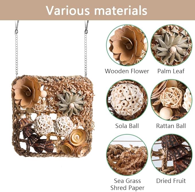 - SAFE MATERIAL: This foraging toy for birds is made from non-toxic, natural materials including wood, sea grass, paper, and dried plants, and comes with metal hooks. It is free of additive chemicals, ensuring your bird's health and safety while it enjoys chewing.