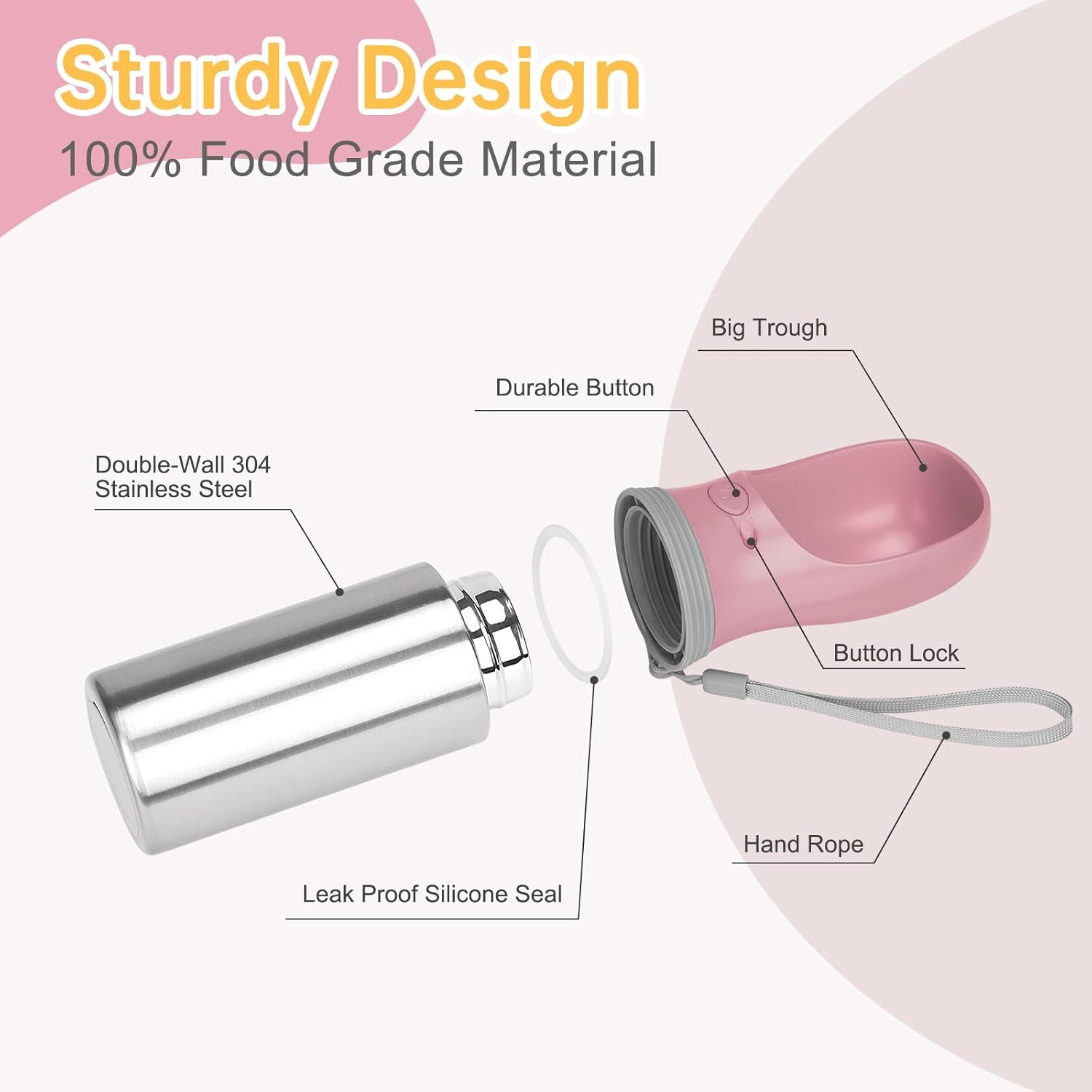 Portable Dog Water Bottle, 14 OZ, Stainless Steel Leak Proof Puppy Water Dispenser with Drinking Feeder for Pets Travel, Walking, Hiking and Outdoor Activities