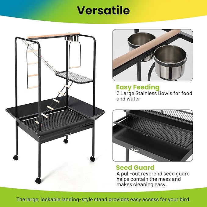 - Premium Construction - Crafted with heavy-duty metal and black hammertone finish, our parrot play gym withstands vigorous play. Includes dual stainless steel cups for food/water and removable seed guard. The pull-out debris tray simplifies cleaning.