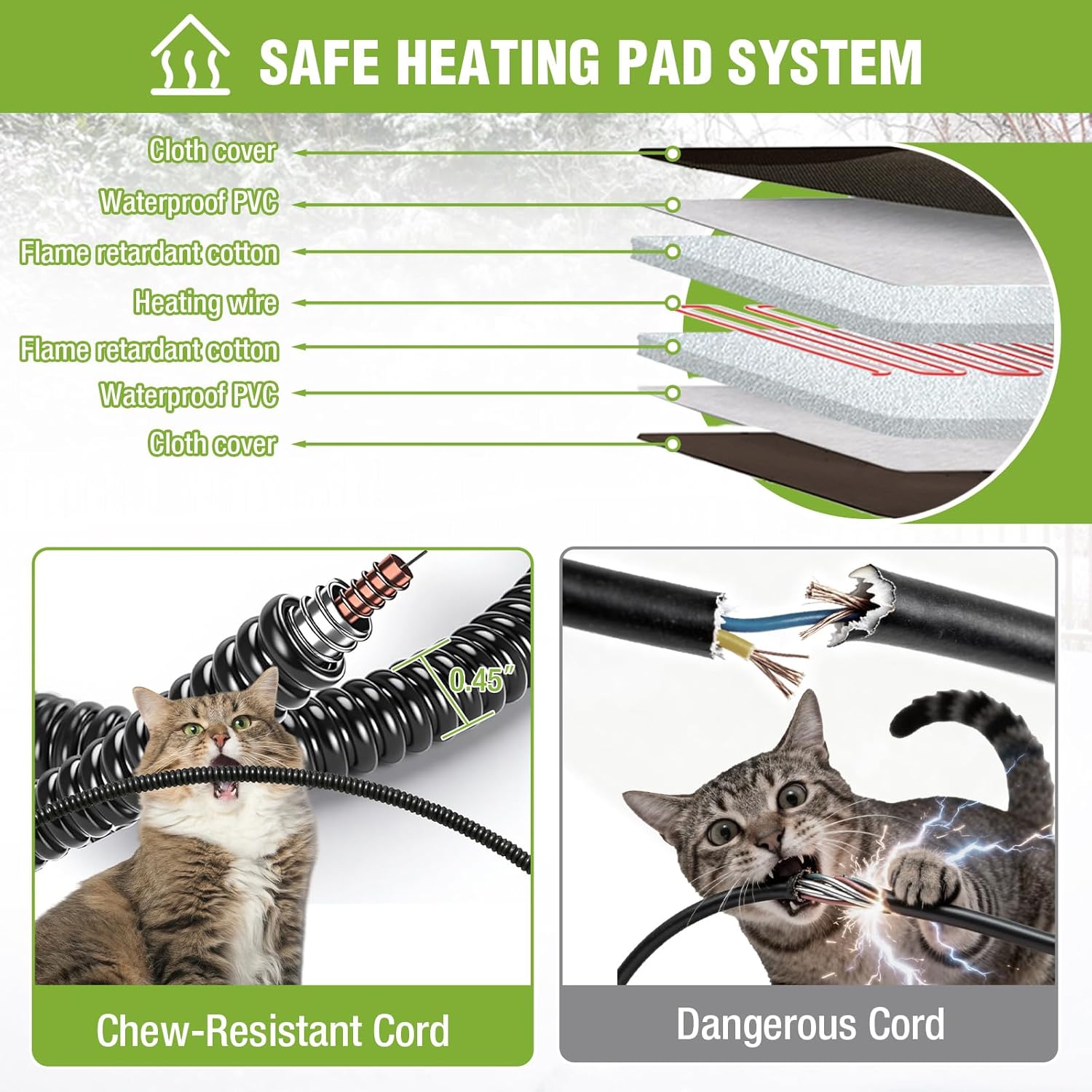 - SAFE HEATING SYSTEM: Equipped with a UL-tested heating pad (automatic temperature control: 89–116°F/32–47°C) and built-in high-temperature protection device, the cat house prevents overheating or chilling. The heating pad is encased in a waterproof enclosure, with a 6.5 ft chew-resistant metal-reinforced cord for enhanced safety. It maintains reliable warmth through rain, snow, or ice, keeping cats dry and cozy