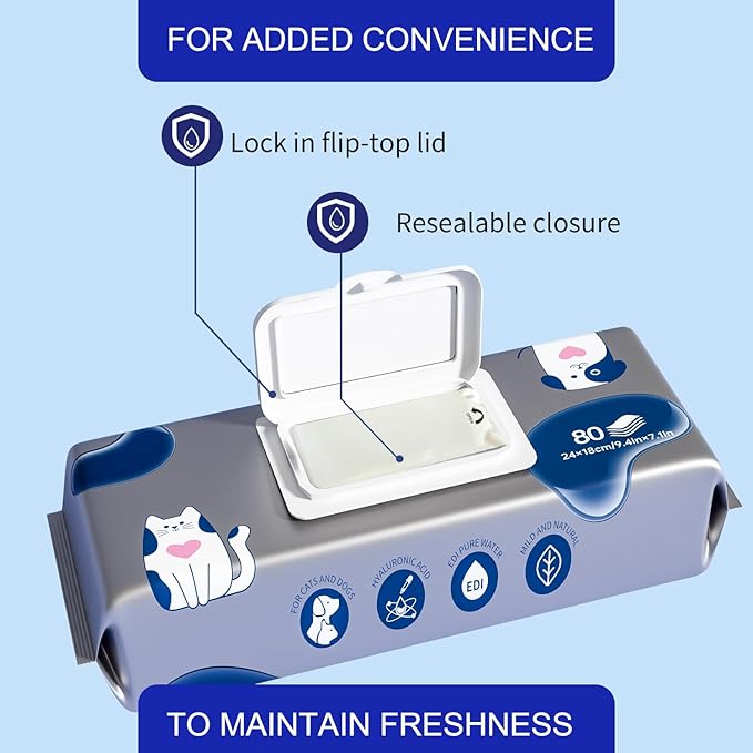 - 【Intimate Packaging Design】:Cat cleaning wipes secure lid helps keep puppy wipes fresh and moist, still lock in moisture, keeps dog cleaning wipes moist and ready whenever you need them. Allowing you to clean your pet at any time, whether at home, on the go, or on outdoor adventures.
