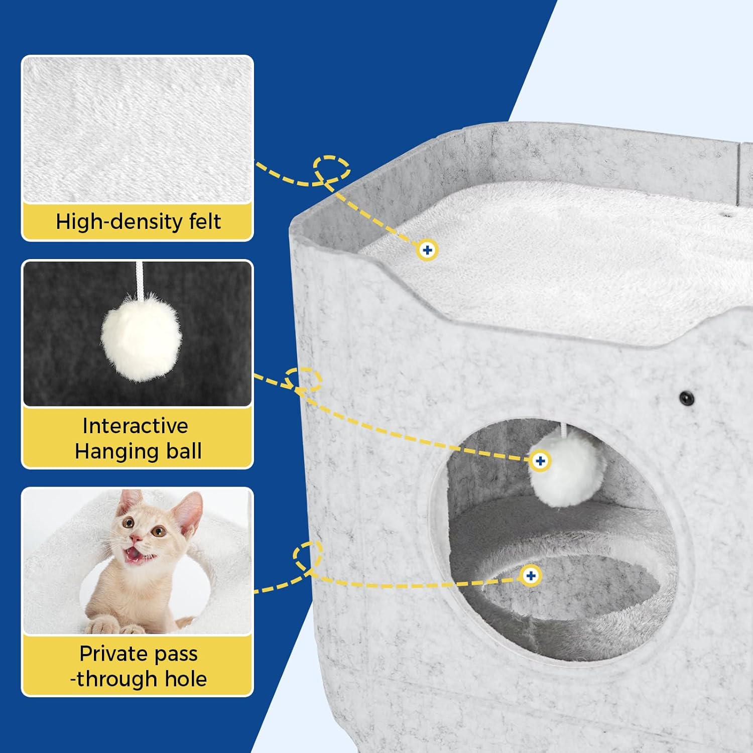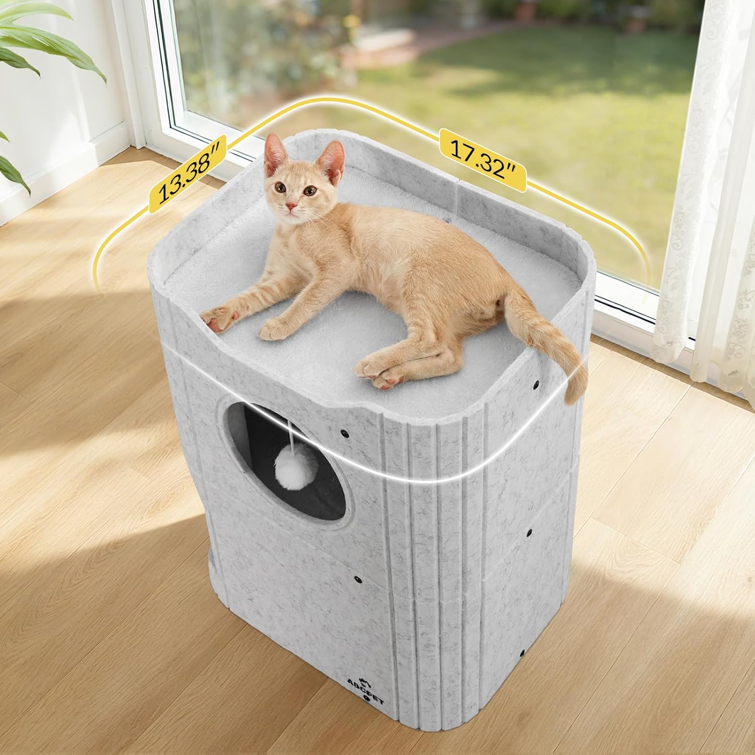 Cat House for Indoor Cats Large Cat Bed Cave 2-Storey Cats Condo with Cozy Felt Covered Hideaway for Multiple Pets Light Gray