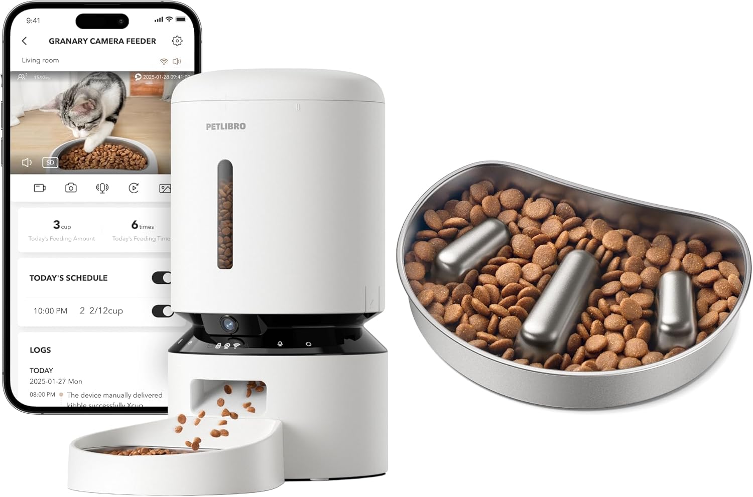 Bundle of PETLIBRO Automatic Cat Feeder with Camera, 1080P HD Video with Night Vision + PETLIBRO Slow Feeder Bowl for Small Dogs & Cats, 1.125 Cup— Anti-Gulp Stainless Steel Dog & Cat Bowl