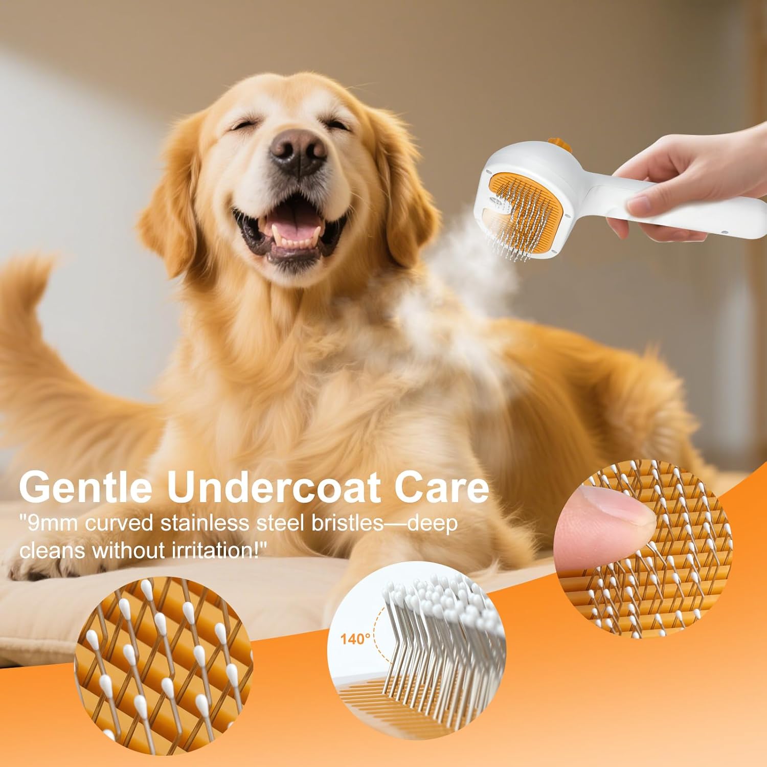 - Multi-Function Pet Mist Brush for Shedding & Hair Care: This pet grooming brush combines de-shedding, mist spray, self-cleaning, and gentle massage functions in one tool. It helps remove loose fur from your dog or cat, reducing tangles and matting for a smooth, neat coat. Suitable for long-haired pets and daily grooming routines.