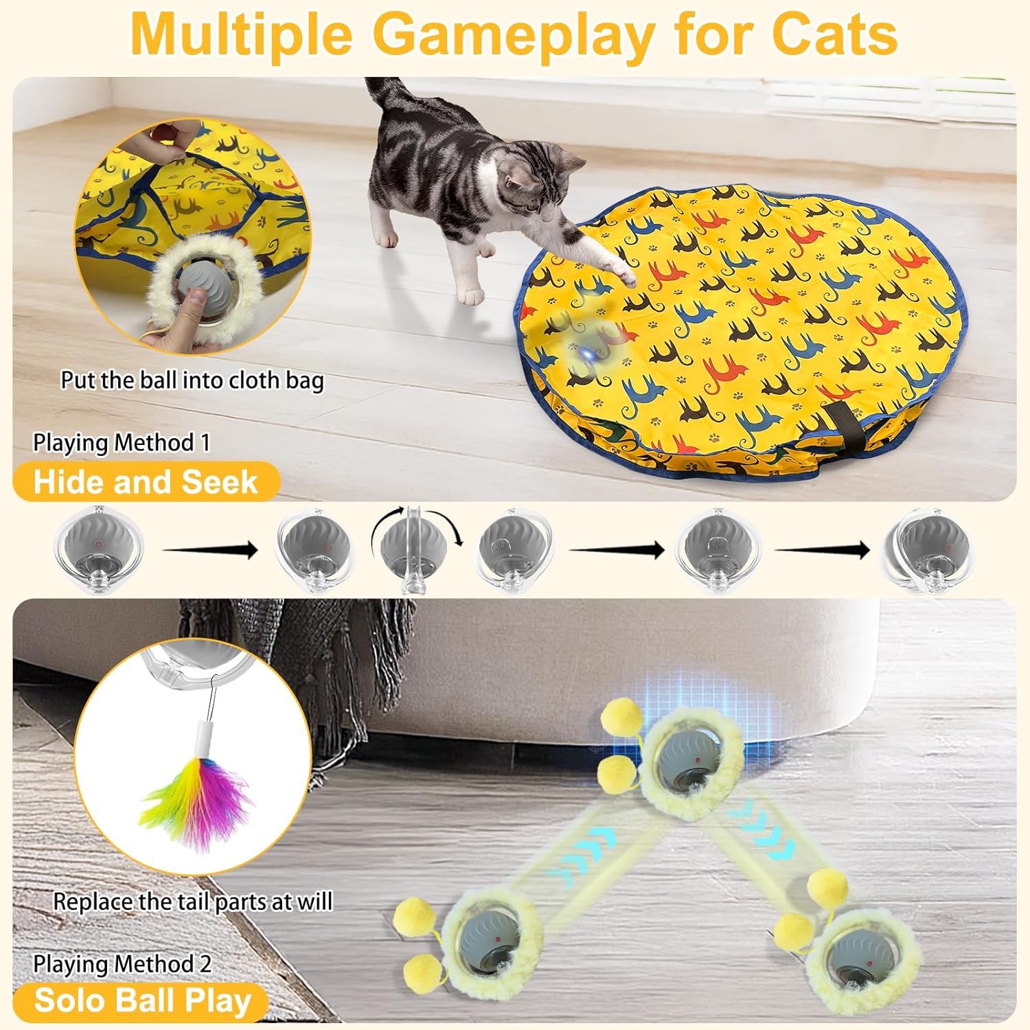 Interactive Cat Toys for Indoor Cats, Automatic Motion Cat Toy in Pouch Fast Rolling Ball in Play Mat Hide and Seek Mouse Catching Game with Chirping Stimulation,Led Light,Auto On/Off(Yellow)